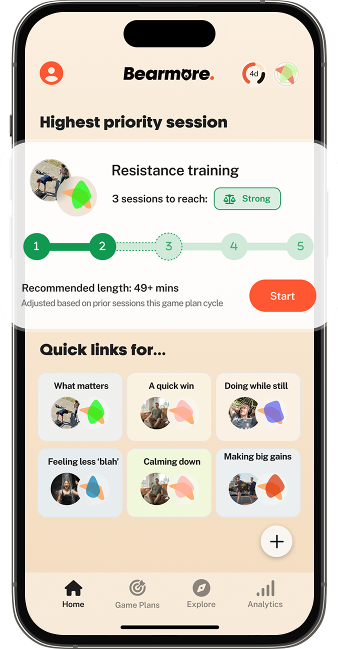 When pressures start piling on, it can be hard to find time for yourself. Rather than letting it all drop away, Bearmore gives you different ways to scale things back, do what you can, and keep your progress going.