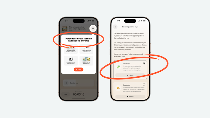 This flexibility is built into the app. You can preview each style before you begin, set a default style that will appear across all guides, anytime you start a guided session. You can also change styles at the start of any new session or even mid-session without needing to restart. Your preferred current settings are always visible alongside other personalisation options, like background tracks or timing markers.