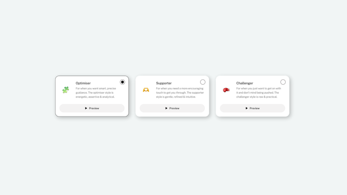 Sometimes the choice is about the activity itself, how you feel about it, and what you need when you're doing it. A cold plunge, for example, might call for the Challenger, giving you direct, no-nonsense direction to get it done. A meditation might feel more accessible with the Optimiser, where precise language helps you understand exactly what you are doing.
